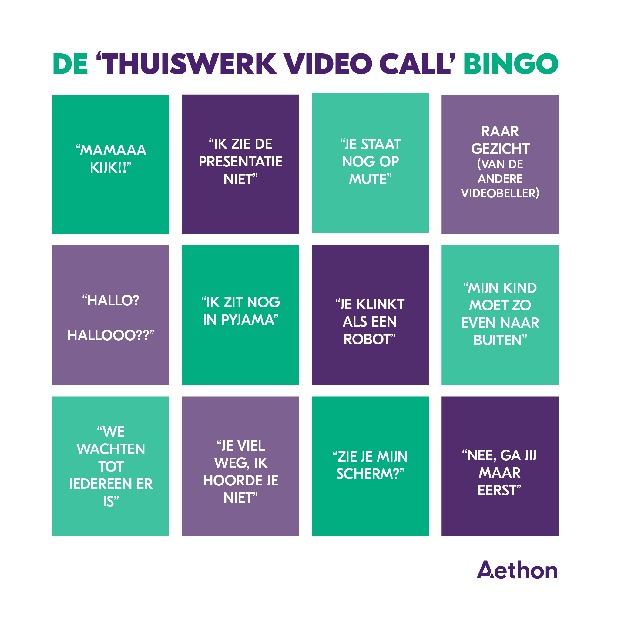 Bij thuiswerken hoort natuurlijk de videoconference. Herken je de uitspraken die we voor je verzameld hebben? Sla de bingokaart op, print ‘m uit en krassen maar! BINGO!